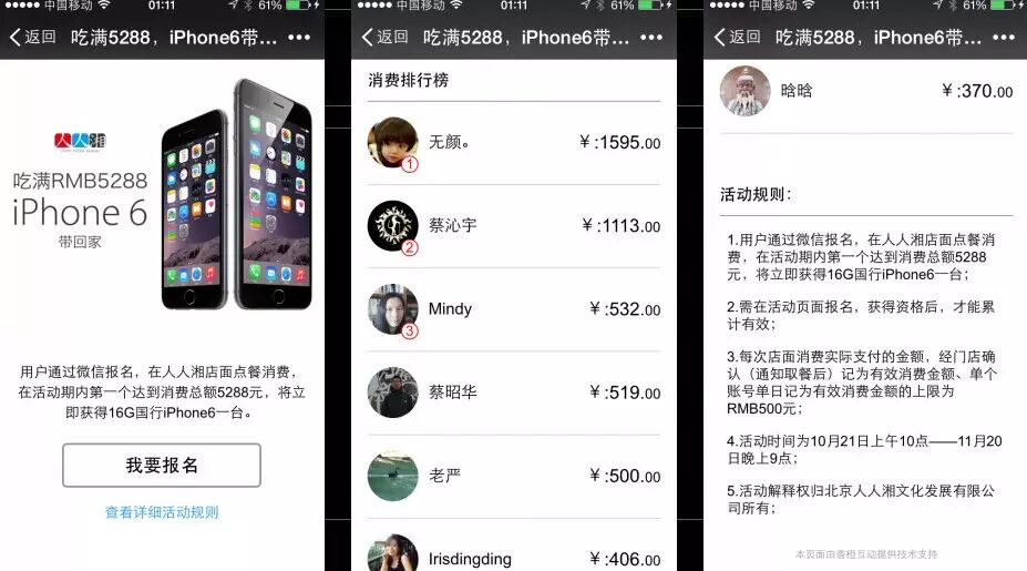 4)与顾客产生黏性真正抢占用户心智。这种点餐系统我们除了可以把所有的用户凝结在自己的微信号上之外,还接入了一个支付宝的扫码并把微信号与之捆绑。要知道,微信支付和微信扫码的的那种方式,仅仅是完成了一个支付动作而已,用户和你之间并没有产生任何关系,更不会在你这停留。而人人湘的这种方式可以不断的通过后续的方式(包括打折和会员结构形式)和顾客之间产生黏性,并吸引顾客留下来,甚至成为你的长期用户。