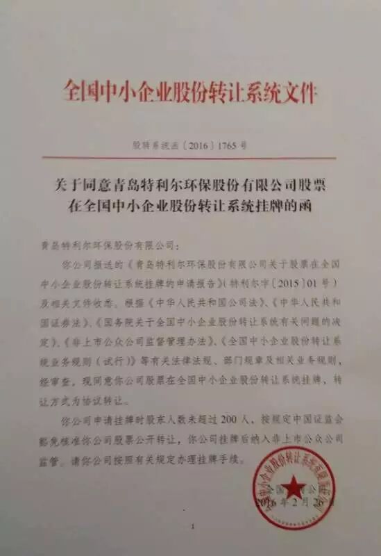公司旗下基金投资的企业——青岛特利尔环保股份有限公司近日取得在全国中小企业股份转让系统挂牌函。