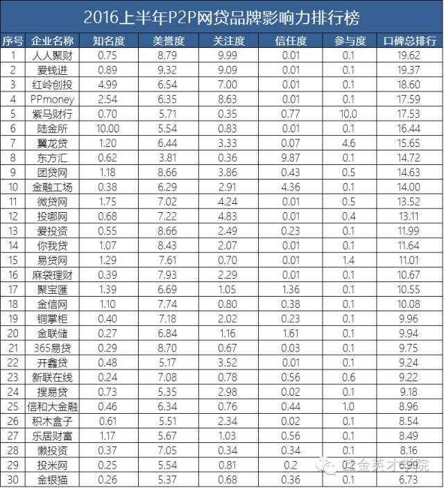 2016年8月7-9日,2016第十届中国品牌节在大连召开,中国互联网金融品牌建设高峰论坛同期召开,互金联盟(北京)市场调查中心下属的互金舆情监测中心发布了《2016上半年P2P网贷品牌影响力排行》。据榜单显示,关注度排名第一的是人人聚财,知名度排名第一的是****,美誉度排名第一的是***,信任度排名第一的***,参与度排名第一的是人人聚财,其中人人聚财、***、***分别荣登品牌影响力排行前三甲。