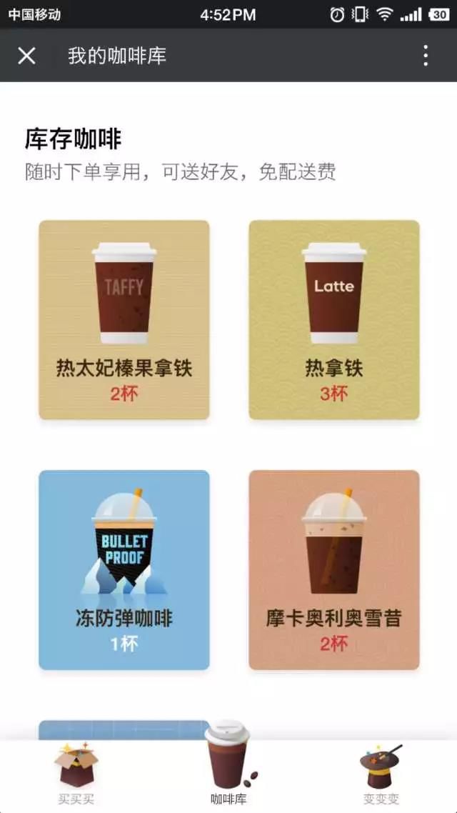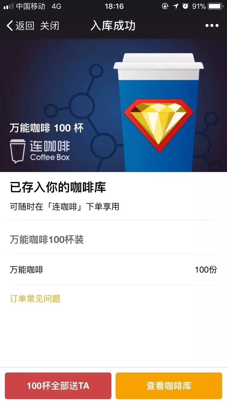 然后买下的100杯咖啡会存储到咖啡库里,可以选择赠送好友,要是来个办公室下午茶,100杯很快就没有了。