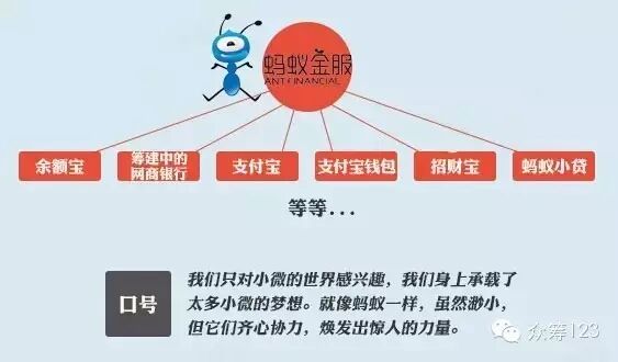 发展轨迹:2014年10月16日,阿里小微金融服务集团以蚂蚁金融服务集团(下称蚂蚁金服)的名义正式成立的,旗下的业务包括支付宝、支付宝钱包、余额宝、招财宝、蚂蚁小贷和网商银行等。预计2017年登陆资本市场,上市地点或为A股。